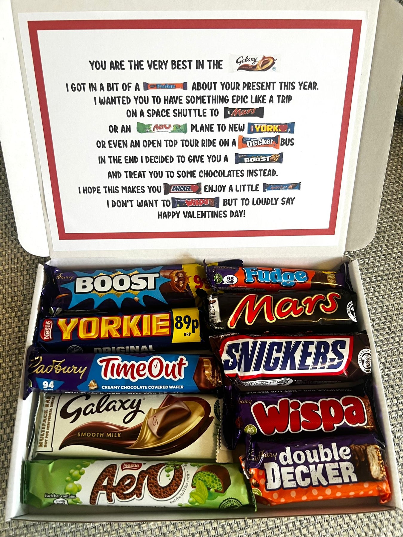 Looking for the perfect Valentine’s chocolate gift? This beautifully presented Valentine’s chocolate box is filled with a delicious selection of popular chocolate bars and finished with a sweet poem, making it a thoughtful and memorable Valentine’s Day present.